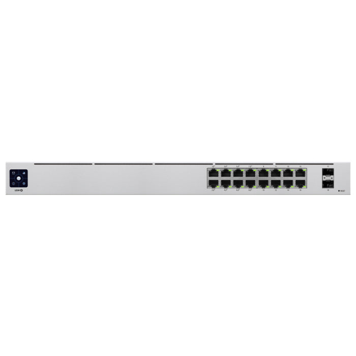 Ubiquiti's USW-16P is a configurable Layer 2 switch. It has 16x Gigabit Ethernet ports that are made up of 8x auto-sensing 802.3at PoE+ ports, 2x 1.25Gbps SFP uplink ports and a PoE budget of 42W. It features a 1.3" touch LCM to provide status information and with a depth of 7.9", the compact fanless design can be easily installed in a SOHO network cabinet.